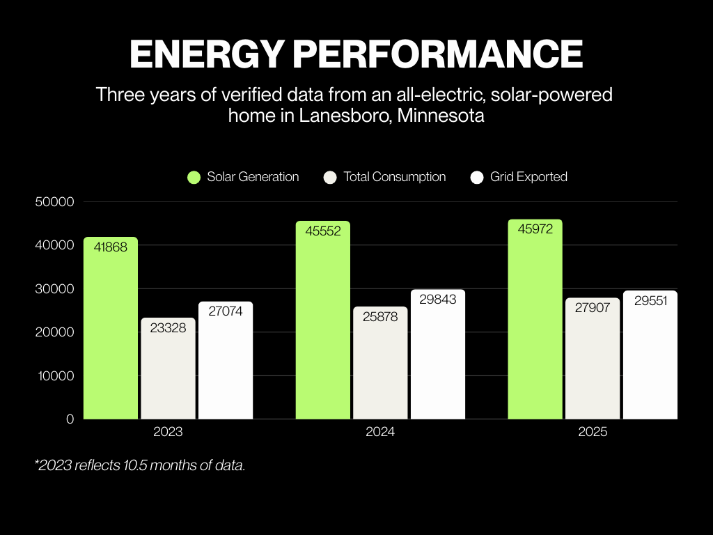 Net-zero sounds expensive. It sounds like something reserved for wealthy early adopters or off-grid idealists willing to sacrifice comfort. The reality, based on three years of data from a real home in southeastern Minnesota, tells a completely different story. (The system went live in February 2023, so the first year captures roughly 10.5 months of production. 2024 and 2025 reflect full calendar years.)